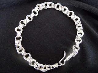 I was going through a box of unfinished projects and found this chain maille bracelet I made a long time ago. I had run out of silver wire and never finished it. I had some silver clasps I had made in another box and quickly hooked on one and it was done!
