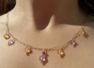Amethyst and Citrine faceted coin shaped gem-stones. 14 KGold-filled: chain, beads, wire and hand-made clasp. One of a kind.